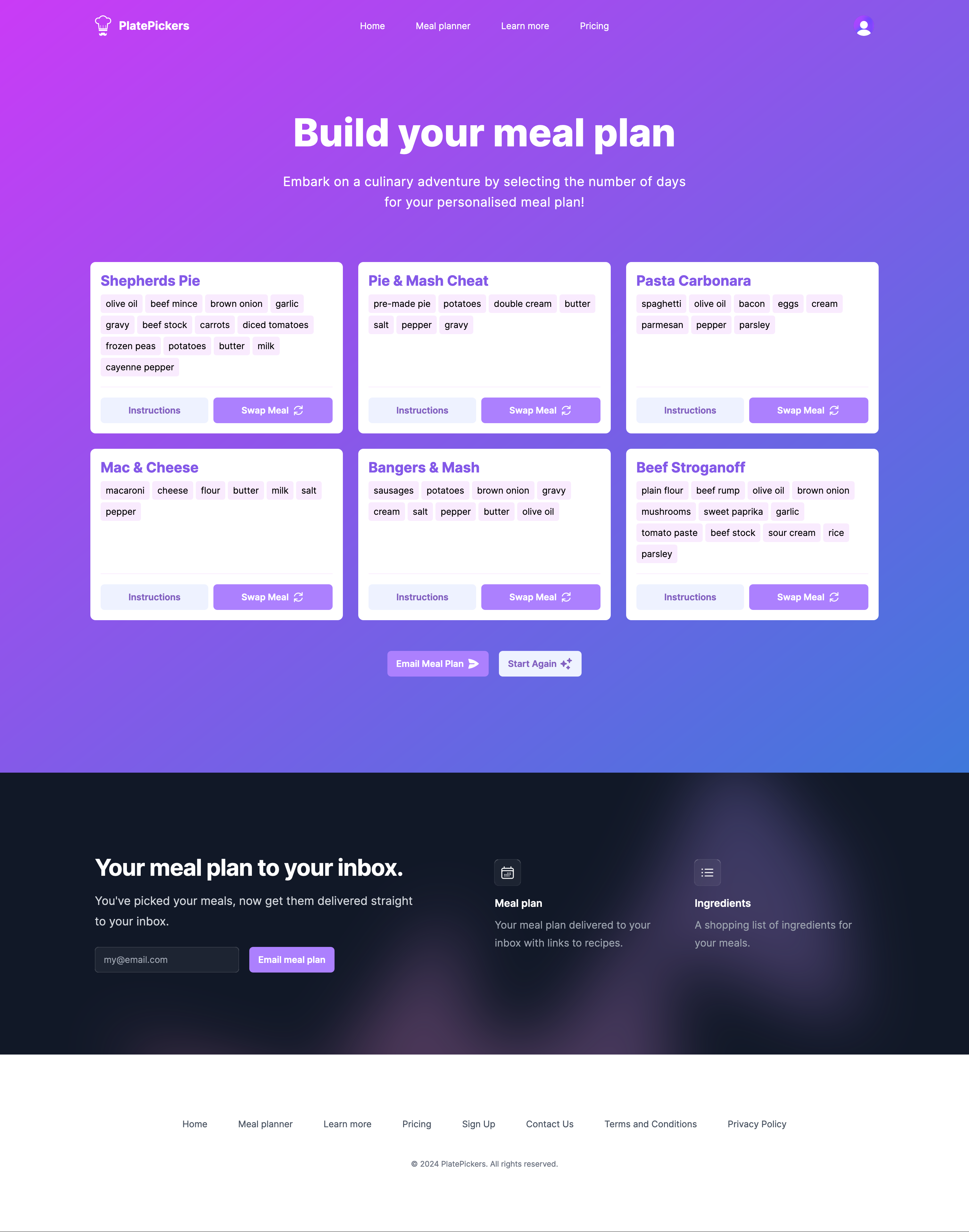My goal on platepickers.com was to take away that cognitive load. You're never actually choosing from a list of meals. We choose them for you, and if you don't like any, you just click a button to swap and we randomly pick another.